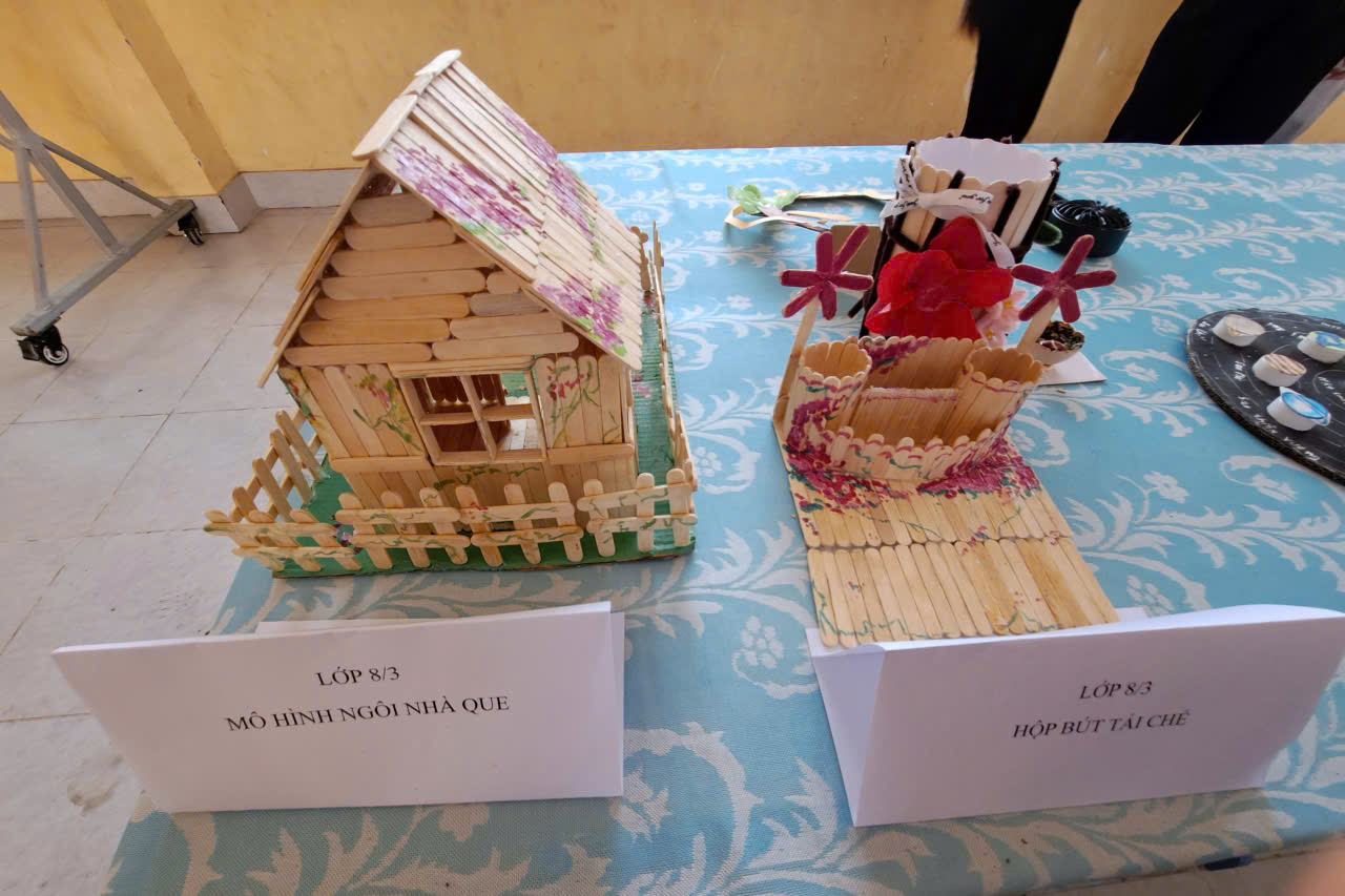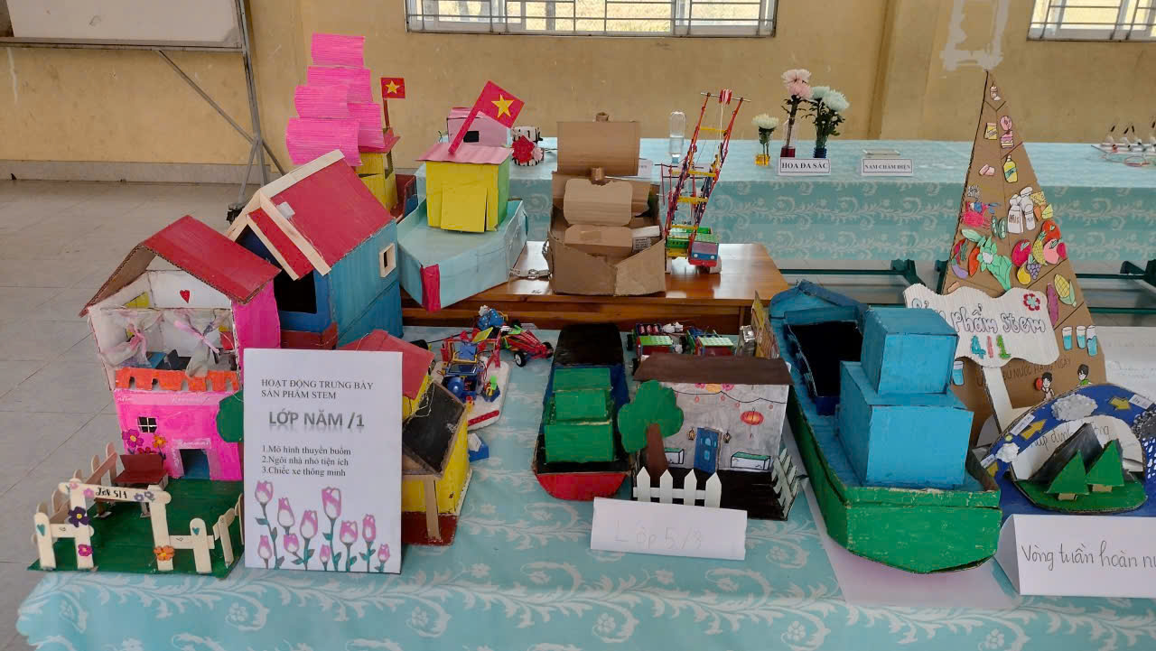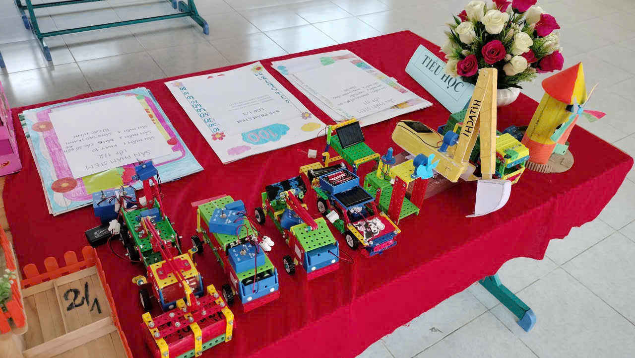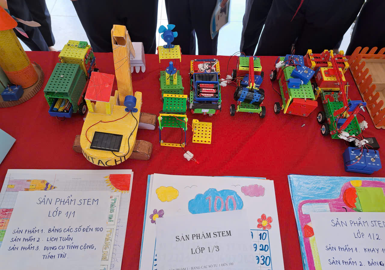 Điểm nhấn của ngày hội là khu vực trưng bày các sản phẩm STEM của học sinh từ khối 1 đến khối 9. Nhiều mô hình và sản phẩm sáng tạo được thiết kế từ những vật liệu quen thuộc, thể hiện sự khéo léo, sáng tạo và khả năng vận dụng kiến thức vào thực tế của học sinh. Mỗi lớp đều có sản phẩm tham gia trưng bày, góp phần làm cho không gian ngày hội thêm phong phú và hấp dẫn.